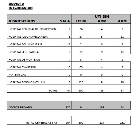 Con este panorama, Salud confirmó que en los hospitales públicos y privados de nuestra provincia hay 264 pacientes internados en salas; 309 en unidades de terapia intermedia; 224 en unidades de terapia intensiva sin asistencia mecánica respiratoria y 151 en terapia intensiva con respirador.