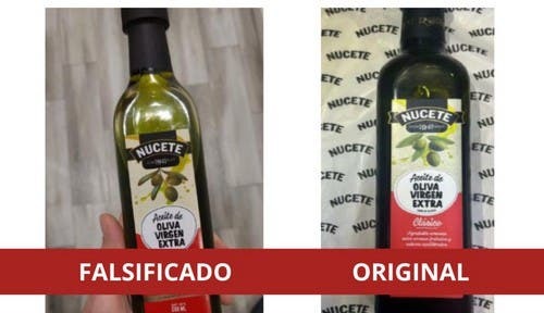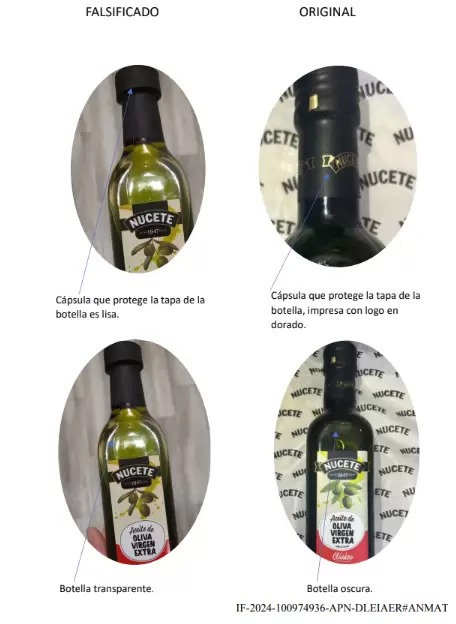 El aceite falsificado se presentaba como un “aceite de oliva virgen extra, clásico” y usaba un envase similar al de Nucete, pero con diferencias notables: en el producto falso, la cápsula de la tapa es lisa en lugar de llevar el logo dorado de la marca; las tapas son de plástico en lugar de metal; y la botella es transparente, mientras que la original de Nucete es oscura. Según ANMAT, las imágenes del producto investigado confirmaron que no fue fabricado por la empresa y que su origen y contenido son desconocidos.