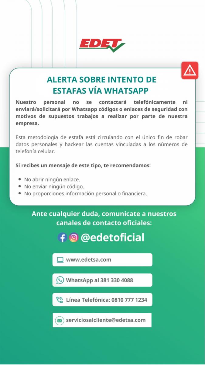 Autino aclaró que el número de Whatsapp oficial de EDET (3813304088) está disponible para problemas de los clientes, y que el número de gestión solo se solicita por llamada al centro de atención al cliente (0810 777 1234), por ejemplo, para cancelar el servicio.