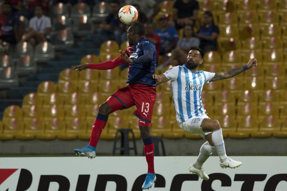 Leonardo Heredia celebra el gol con el que Atlético Tucumán empató la serie. Luego quedaría eliminado por penales ante el DIM (Photo by Walter Monteros / AFP)