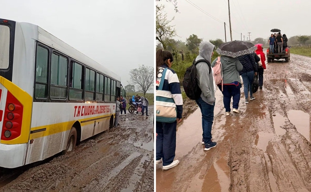 Docentes y alumnos de escuelas rurales quedaron varados este lunes en la Ruta 306, en el departamento Leales, cuando el colectivo en el que viajaban hacia Los Gómez quedó atascado en el barro por el mal estado del camino tras las lluvias; ante la imposibilidad de avanzar, los pasajeros debieron bajar y continuar el trayecto en una camioneta particular para poder llegar a destino.