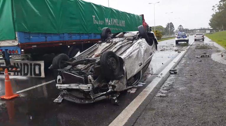 La unidad, un Chevrolet Prisma, que circulaba de norte a sur, perdió el control, impactando contra el guardarrail y volcando.