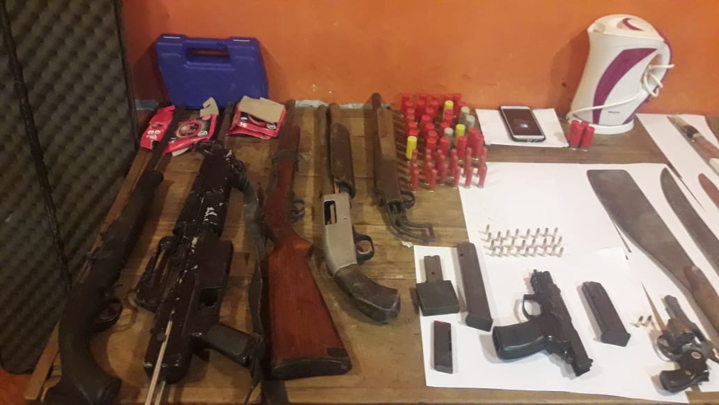 “En uno de los inmuebles allanados que funciona como un aguantadero nos llamó la atención que había tierra removida en el piso, por eso decidimos excavar dándonos con una sorpresa: hallamos fundas y cajas con una gran cantidad de armas que fueron secuestradas, dijo el Comisario Valdez.