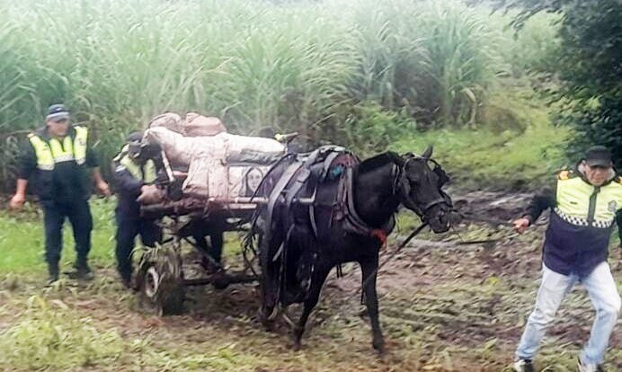 Los agentes intentaron identificarlos, pero los hombres escaparon, dejando el carro y la mercadería en el lugar. La policía trasladó los elementos a la comisaría, donde se constató que se trataba de un caballo zaino oscuro sin marca de propiedad, un carro tipo sulky de madera con ruedas de automóvil y ocho bolsas arpilleras con choclos.