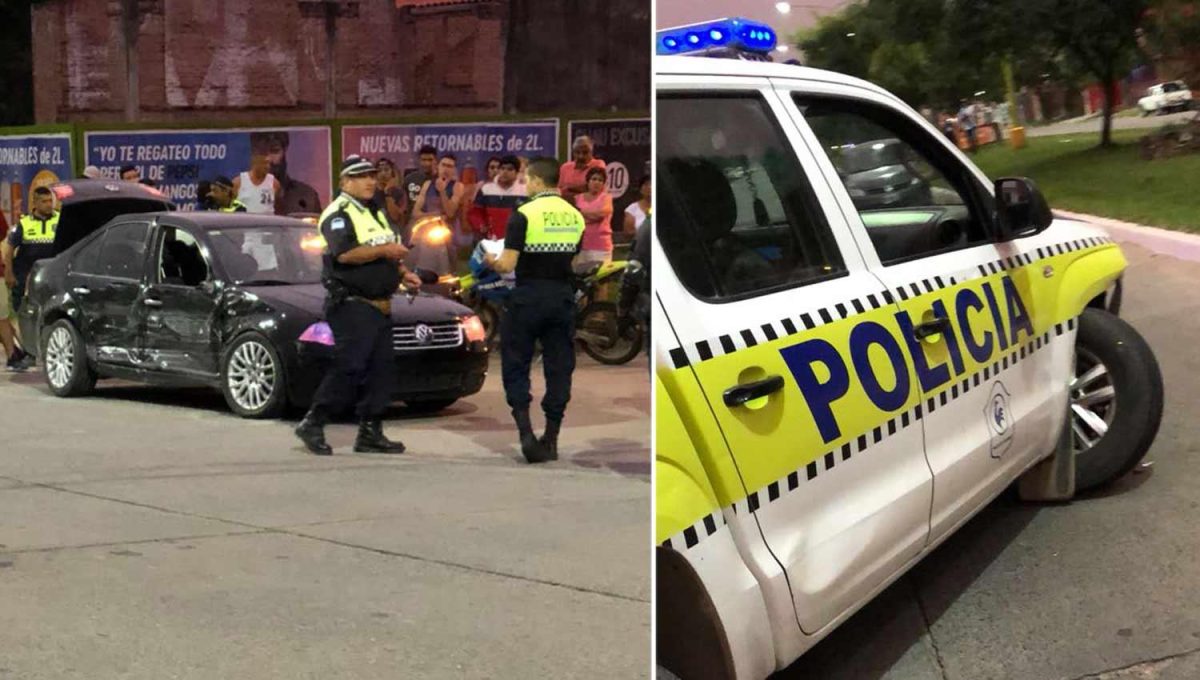 Anoche, antes de las 20, una pareja que viajaba en un Volkswagen Bora protagonizó una persecución que terminó en un choque a una camioneta y una moto de la Policía, en la avenida Perón al 100.El vehículo intentaba escapar de un control policial cuando fue embestido por los oficiales.