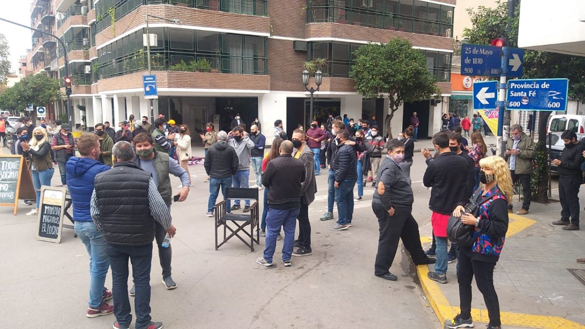 La esquina de Santa Fe y 25 de Mayo se convirtió en el epicentro de la protesta del sector privado contra las nuevas restricciones adoptadas contra el coronavirus en Tucumán. Por eso, por estas horas, se producen reclamos por parte de los empresarios del sector gastronómico que piden poder abrir sus negocios y reiteran que piensan no acatar las medidas en caso de que no