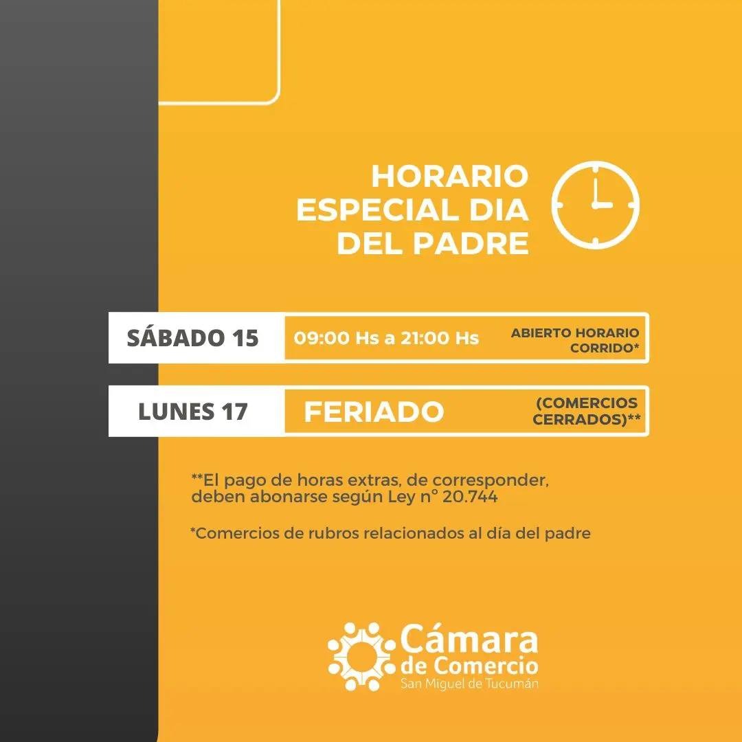 Este fin de semana, Tucumán y el resto del país celebrarán el Día del Padre, acompañado del feriado del lunes 17 de junio en honor al General Don Martín Miguel de Güemes. La Cámara de Comercio de San Miguel de Tucumán informó que, debido a la crisis y recesión en el sector, se ajustarán los horarios comerciales para aprovechar las celebraciones y fomentar las ventas.