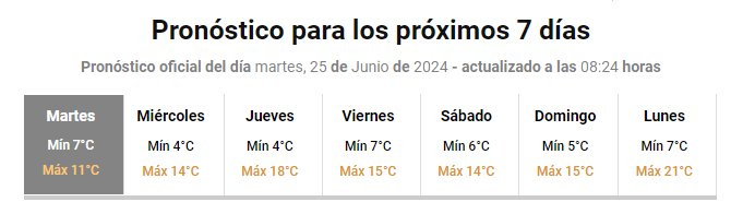 El jueves se espera que sea el día más cálido de la semana, con una mínima de 4 °C y una máxima que podría llegar a 15 °C, gracias al cielo despejado. No obstante, el frío regresará a partir del viernes, con una mínima de 6 °C y una máxima de 8 °C. Para el fin de semana, se pronostica una mínima de 0 °C y una máxima de 10 °C.