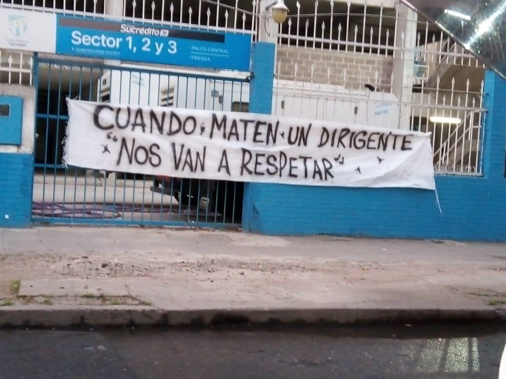 Durante la madrugada de este jueves, alguien (aún se desconoce si solo o acompañado) colgó una bandera en el acceso principal del estadio, sobre calle 25 de Mayo. El mensaje de la bandera encendió la alarma en la Comisión Directiva del club: “cuando maten un dirigente nos van a respetar”.