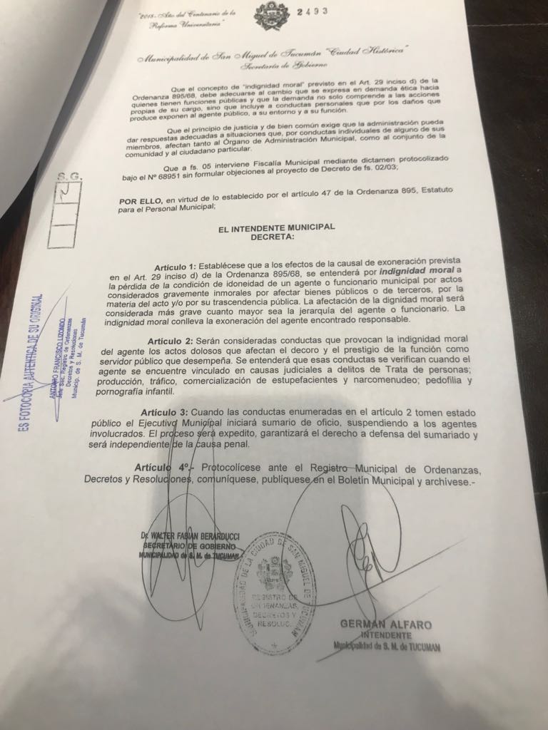 Un decreto del intendente de la Capital, Germán Alfaro  avanza sobre la suspensión y el apartamiento definitivo de agentes y funcionarios municipales que sean eventualmente acusados de delitos vinculados con “trata de personas, producción, tráfico, comercialización de estupefacientes y narcomenudeo; pedofilia y pornografía infantil”.