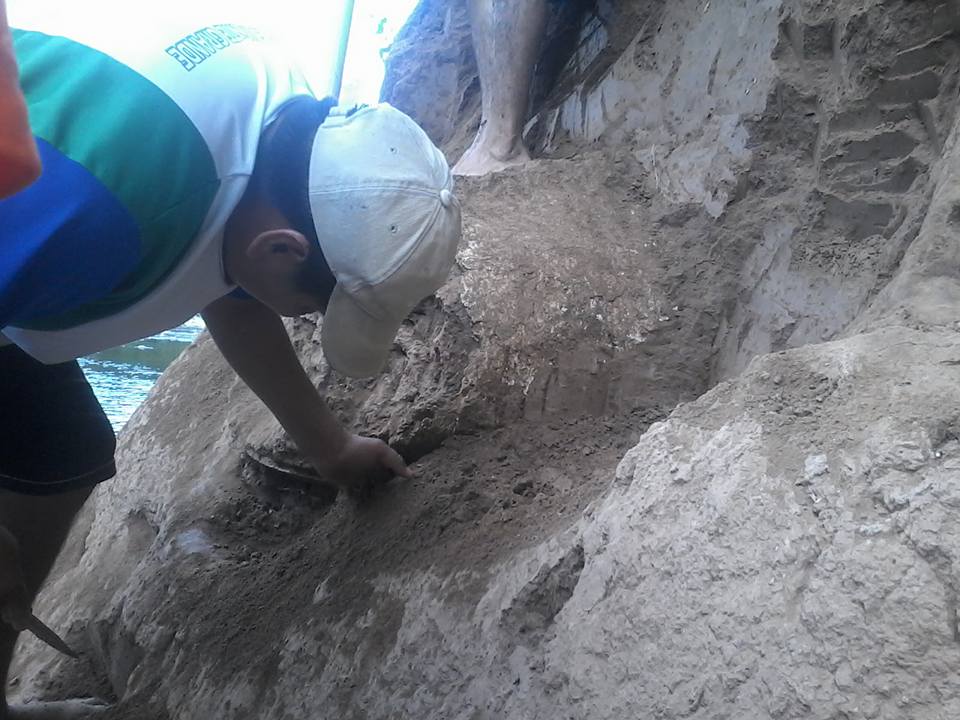 En la playa formada a la vera del río puede verse un elemento extraño en la otra orilla. Después de cruzar la corriente de aguas tranquilas se puede distinguir la forma de un caparazón incrustado en la barranca.