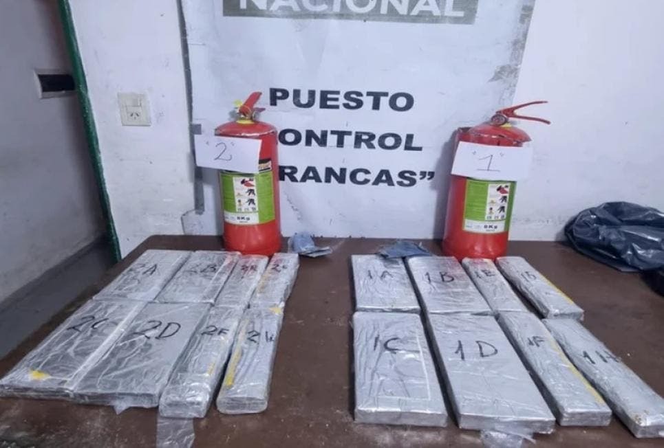 Al revisar más a fondo, los gendarmes utilizaron un perro entrenado que marcó la presencia de drogas, y luego confirmaron la sospecha con un escáner. Dentro de los matafuegos encontraron ocho paquetes con una sustancia blanca, que fue identificada como cocaína tras realizar el test correspondiente, con un peso total de 12 kilos y 799 gramos.
