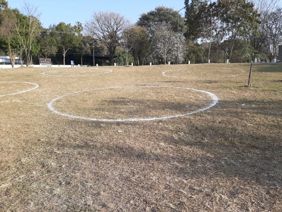 Los vecinos que quieran compartir con sus familias deberán ubicarse dentro de los círculos pintados en el suelo, que están distribuidos para evitar el contacto con otras familias y evitar, de esa manera, la propagación de coronavirus.
