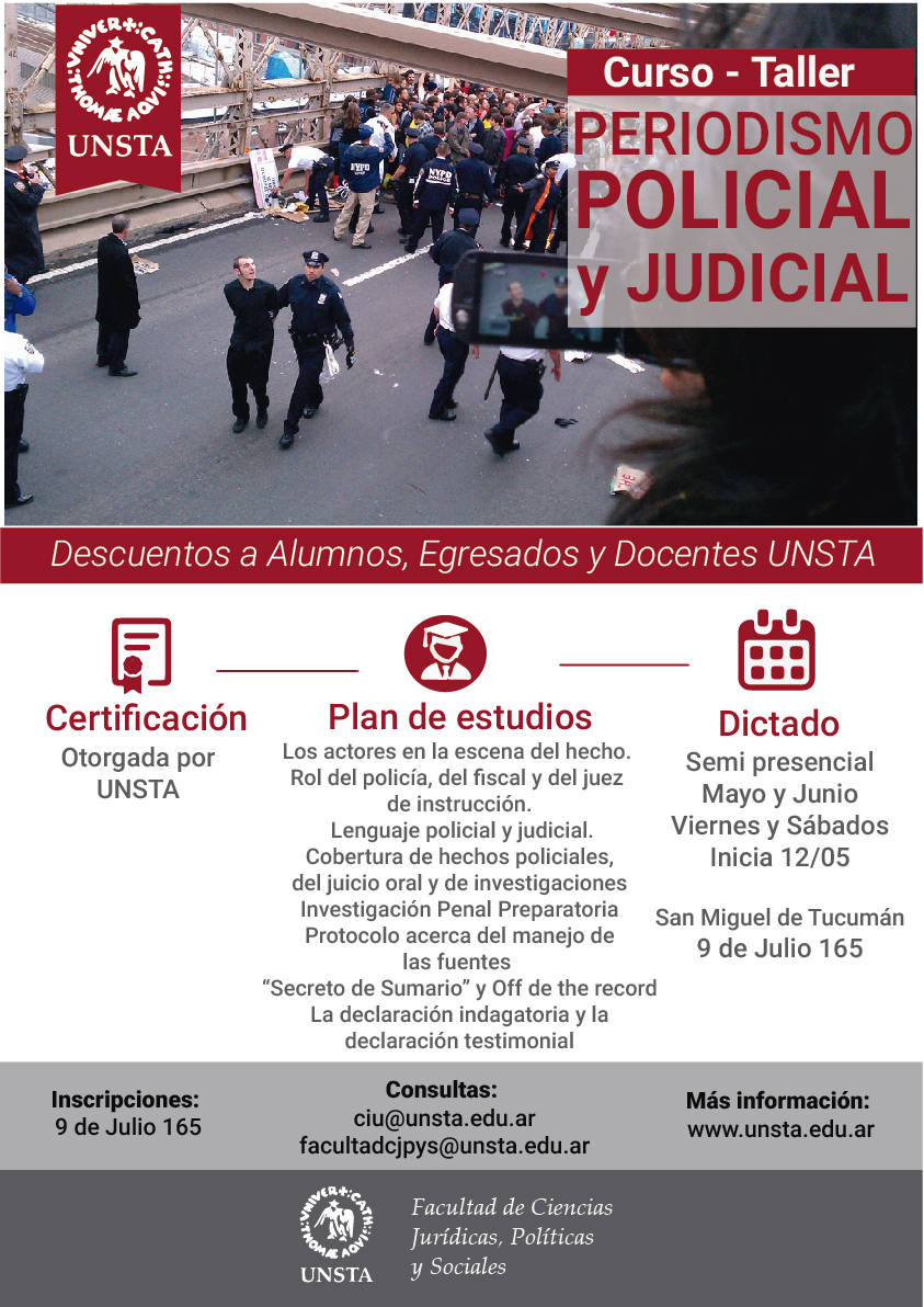 Por informes e inscripciones enviar un correo electrónico a [email protected] o [email protected] y [email protected] o dirigirse a 9 de Julio 165. También en la página www.unsta.edu.ar a través de http://www.unsta.edu.ar/periodismo-grafico-policial-y-judicial/