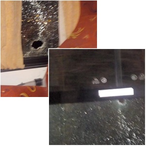 Inicialmente el viderio quedó totalmente astillado (como se observa en la foto), “por suerte no había nadie sentado allí” señaló el chofer.