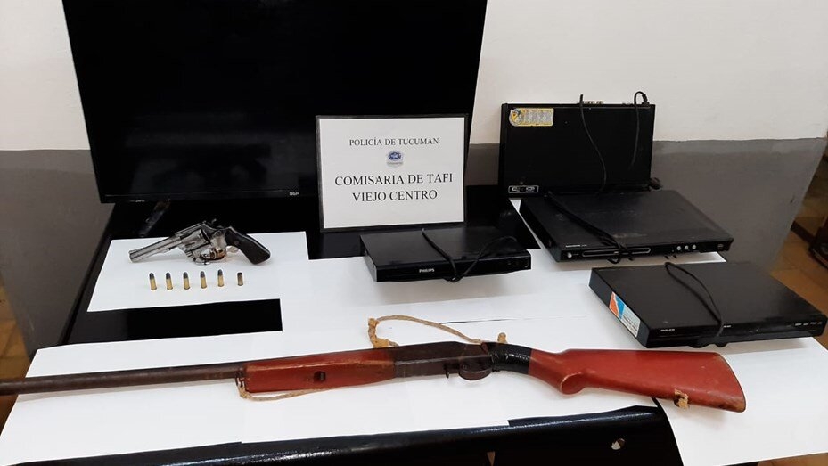 En el lugar, se secuestraron una escopeta calibre 12.70, un revólver 32 largo con seis cartuchos, un televisor LED de 32 pulgadas y tres lectores de DVD, que ninguno pudo justificar su propiedad.