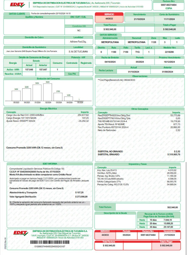 Un local comercial en Tucumán, cerrado hace meses debido a la crisis económica, recibió una factura de EDET de 502.940 pesos este mes, pese a haber registrado solo 1 kWh de consumo de electricidad.