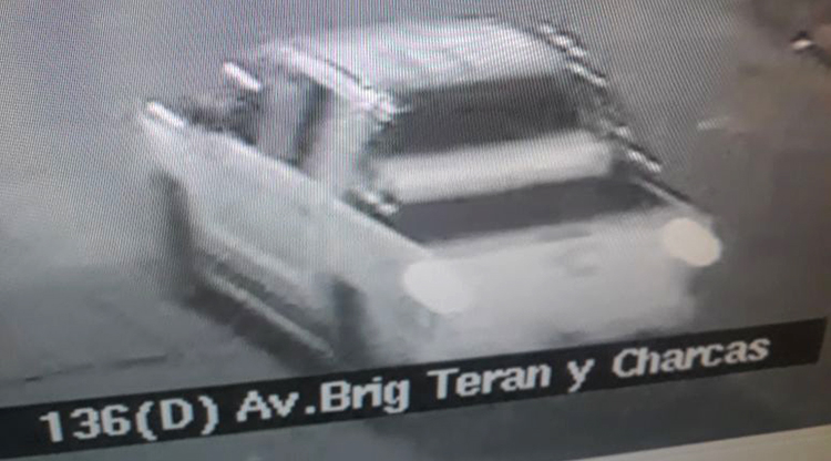 Por la tarde del martes, los pesquisas pudieron seguir armando el rompecabezas a partir de chequear la imagen que devolvía una cámara de seguridad en el lugar: allí pudieron ver como el homicida ataca a las víctimas y se fuga en una camioneta. La nitidez de la imagen no es la mejor pese a que pudieron desentrañar de que se trataría de una Toyota Hilux color blanca-o al menos claro- según la secuencia de imágenes. Las mismas fueron difundidas por la Secretaría de Estado de Comunicación Pública. La imagen congelada indica que la filmación se realizó en la Avenida Brígido Terán y Charcas.