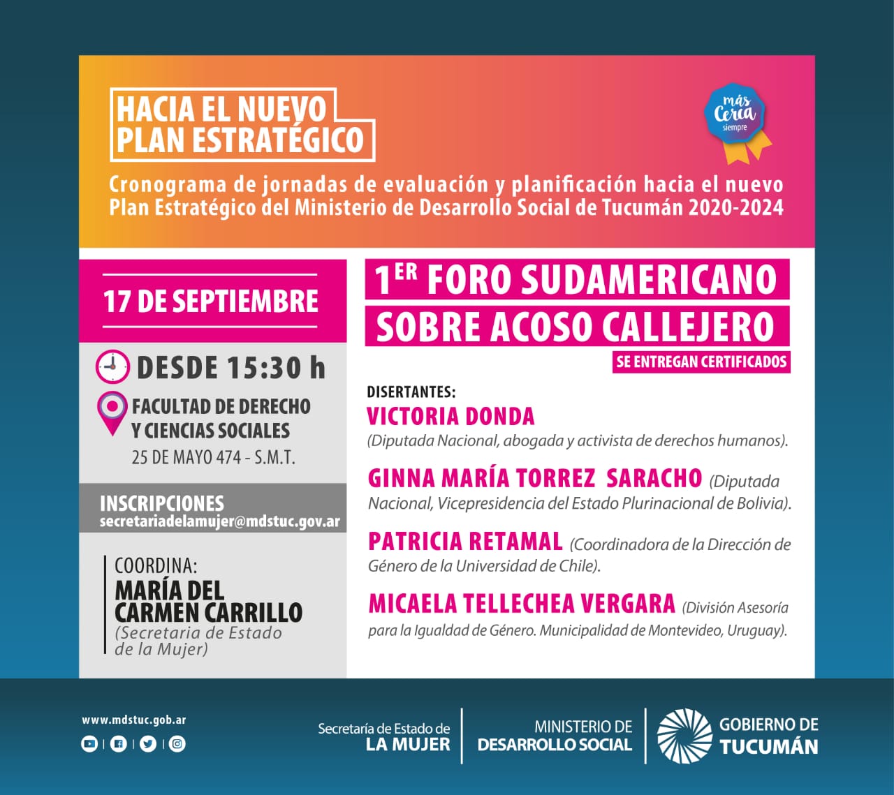 Con la asistencia de referentes y especialistas de todo el país empezará en la tarde de este martes, el Primer Foro sudamericano sobre acoso callejero: será desde las 15.30 en la en la Facultad de Derecho y Ciencias Sociales de la Universidad Nacional de Tucumán (UNT-25 de Mayo 474) con la coordinación de la Secretaría de Estado de la Mujer del Ministerio de Desarrollo Social.