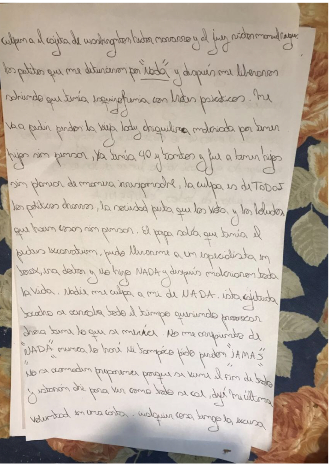 “Culpen al ca…de Washington Navarro y al juez Víctor Manuel Rougués. Son los p…que me detuvieron por nada y después me liberaron sabiendo que tenía esquizofrenia con brotes psicóticos. Me va a pedir perdón la vieja lady chiquilina malcriada por tener hijos sin pensar, ya tenía 40 y tantos y fue a tener hijos sin planear de manera irresponsable. La culpa es de TODOS los políticos chorros, la sociedad puta que los vota y los boludos que hacen eso sin pensar. El papá sabía que tenía el pectus exavatium pudo llevarme a un especialista en torax, era doctor y no hizo NADA y después malcriaron toda la vida. Nadie me culpa a mí de nada. Esta ca… Tacacho se acercaba todo el tiempo queriendo provocar. Ahora tiene lo que se merece. No me arrepiento de NADA, nunca lo haré ni tampoco pido perdón jamás. No se acomoden, preparense porque se viene el fin de todo y estarán ahí para ver como todo se cae. Dejé mi última voluntad en una carta. Cualquier cosa tengo la excusa de que tengo una condición mental corroborada. Sigan votando chorros como Cristina y los demás peronistas y creyendo que así van a funcionar las cosas. Al carajo con todo. . La culpa es de todos…chupenla”