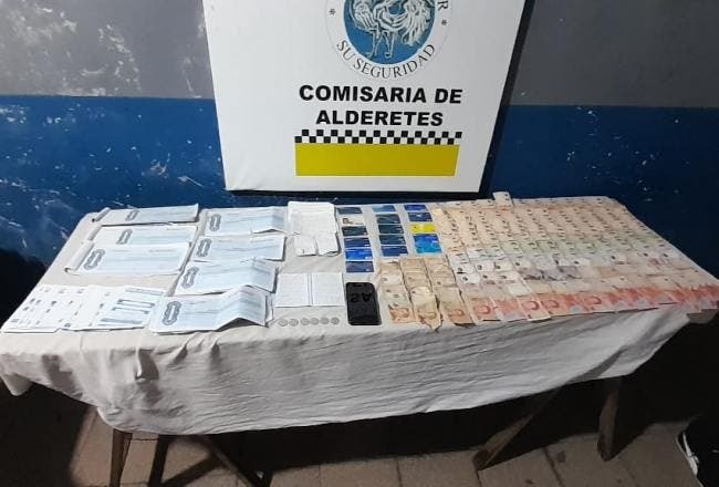 La policía detuvo a un hombre que tenia: tarjetas de debito de distintos bancos, talonarios de recibos, comprobantes de pago y otros elementos que se sospecha que serian utilizados para estafar.