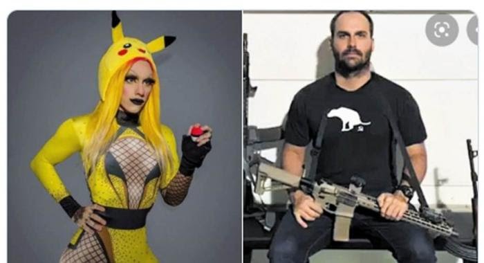 “El hijo del presidente de la Argentina/El hijo del presidente de Brasil”, eso dice el provocador posteo en donde aparece contrastada una foto de Fernández como drag queen y disfrazado del personaje principal de la serie de animé Pokémon, con una de Bolsonaro, que porta un arma de gran calibre.