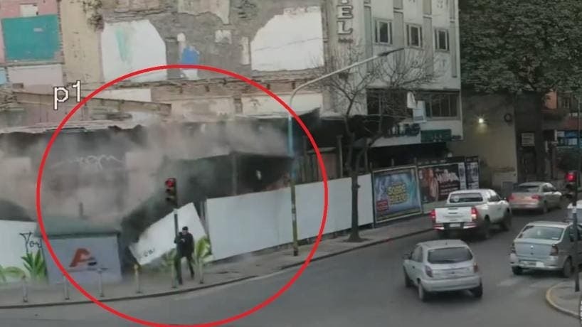 El suceso fue captado por las cámaras de seguridad del Ministerio de Seguridad, mostrando el instante exacto en que el techo de la propiedad en demolición se desmoronó. Milagrosamente, un peatón logró salvarse por muy poco.