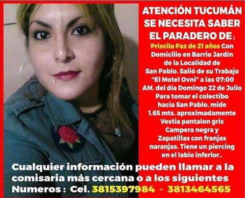 Atención San Pablo!!                                                                                                            cómo es de conocimiento público la desaparición de Priscila paz , y desde lo más profundo de nuestro corazón rogamos por su pronta aparición. Ya que hay una familia que está viviendo momentos angustiantes y por sobre todo su hijo espera por su mamá.                                                                                      Junto a Julieta Araceli Aragón de luna moda, Maira Bracamonte de MCSEstilo Infantil , Flor Barrera de florever showroom , Luciana Albornoz y quién les escribe Alejandra acuña de indumentaria L&C nos unimos para realizar un sorteo a beneficio de la familia de Priscila paz! , El mismo contará con 6 premios , el valor de la rifa es de tan solo $50 , podrán conseguirla en calle principal flia Aragón, calle 7 N°411 B° la Boca flia Bracamonte, en barrio San Nicolás MZA 12 casa 5 flia acuña , y en MZA 14 casa 16 flia barrera también en estética de Luciana albornoz.. el sorteo se realizará el día 03/08/2018 por una trasmisión en vivo por facebook.. cabe destacar que todo lo recaudado irá para la flia de Priscila.                          Vivimos tiempos donde la inseguridad nos invade, dónde salís y no sabes si vas a regresar, estamos rodeados de gente con el corazón lleno de odió y maldad, Priscila salió de su trabajo con regreso a su domicilio al cual nunca llegó, hoy le tocó a ella mañana puede ser cualquiera de nosotros, por eso pido que ayudemos a la familia paz que no los dejemos solos en esta lucha porque Priscila tiene que aparecer, entre todos podemos colaborar aportando nuestro granito de arena, recuerden que la unión hace a la fuerza !! Confío en la solidaridad de la gente de San Pablo!!! Ayudemos a la flia paz. San Pablo