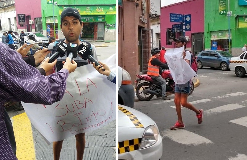 El muchacho en cuestión se ubicó en la esquina de San Martín y Monteagudo con una pancarta visible: “No a la suba del boleto. Sumate!.”
