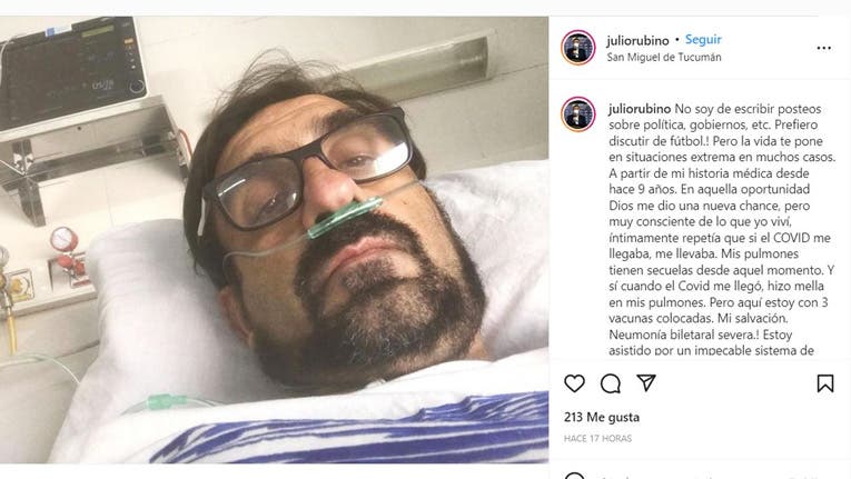 “No soy de escribir posteos sobre política, gobiernos, etc. Prefiero discutir de fútbol. Pero la vida te pone en situaciones extrema en muchos casos. A partir de mi historia médica desde hace 9 años. En aquella oportunidad Dios me dio una nueva chance, pero muy consciente de lo que yo viví, íntimamente repetía que si el COVID me llegaba, me llevaba. Mis pulmones tienen secuelas desde aquel momento. Y sí cuando el Covid me llegó, hizo mella en mis pulmones. “Pero aquí estoy con 3 vacunas colocadas. Mi salvación. Neumonía bilateral severa!”, posteó Rubino en su cuenta de Instagram, donde relató lo que vivió a partir de su diagnóstico, y acompañó la publicación con una foto de él mismo, en una cama del hospital.
