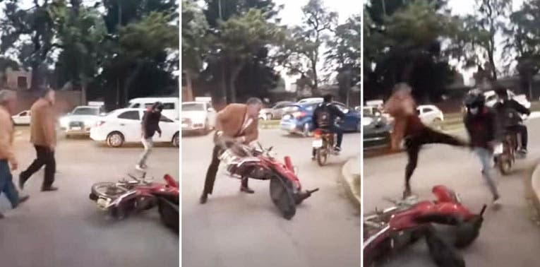 Justamente, eso se ve en las imágenes del video que se viralizó. “¡Corré, corré…”, le gritan al motociclista para que se ponga a salvo del ataque furioso del hombre de la camioneta, que lanza patadas y luego arroja la moto contra el asfalto.