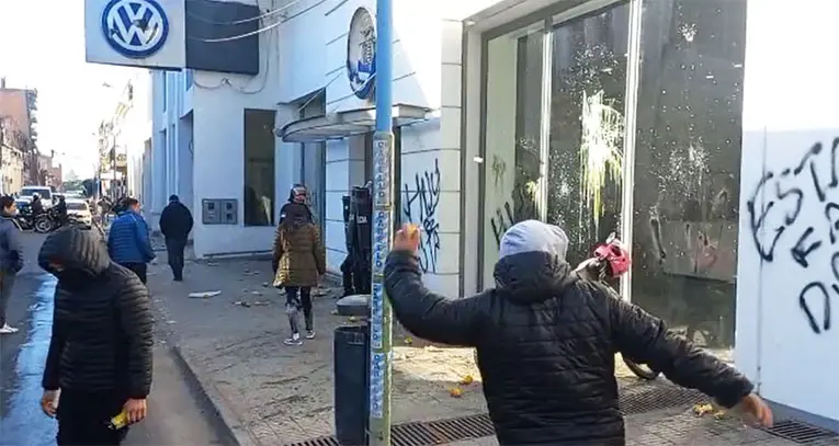 Los furiosos manifestantes lanzaron huevos y objetos contundentes contra las vidrieras de la firma, al tiempo que tildaban a los Alperovich de “estafadores y ladrones”.