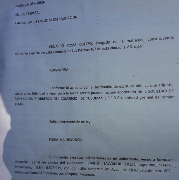 La denuncia radicada lleva la firma del abogado Eduardo Posse Cuezzo, apoderado de la Sociedad de Empleados y Obreros del Comercio de Tucumán (SEOC) y fue presentada este martes en la justicia federal contra Emilio Luque por “defraudación“.
