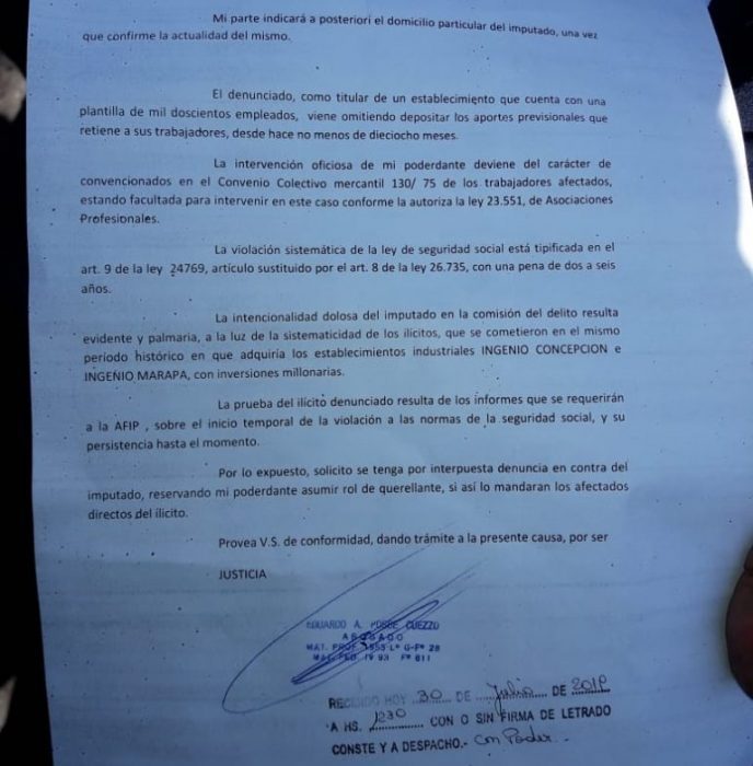 Argumenta que el empresario, a cargo de 1.200 empleados, viene omitiendo depositar aportes previsionales que son retenidos a sus trabajadores, desde hace no menos de dieciocho meses.