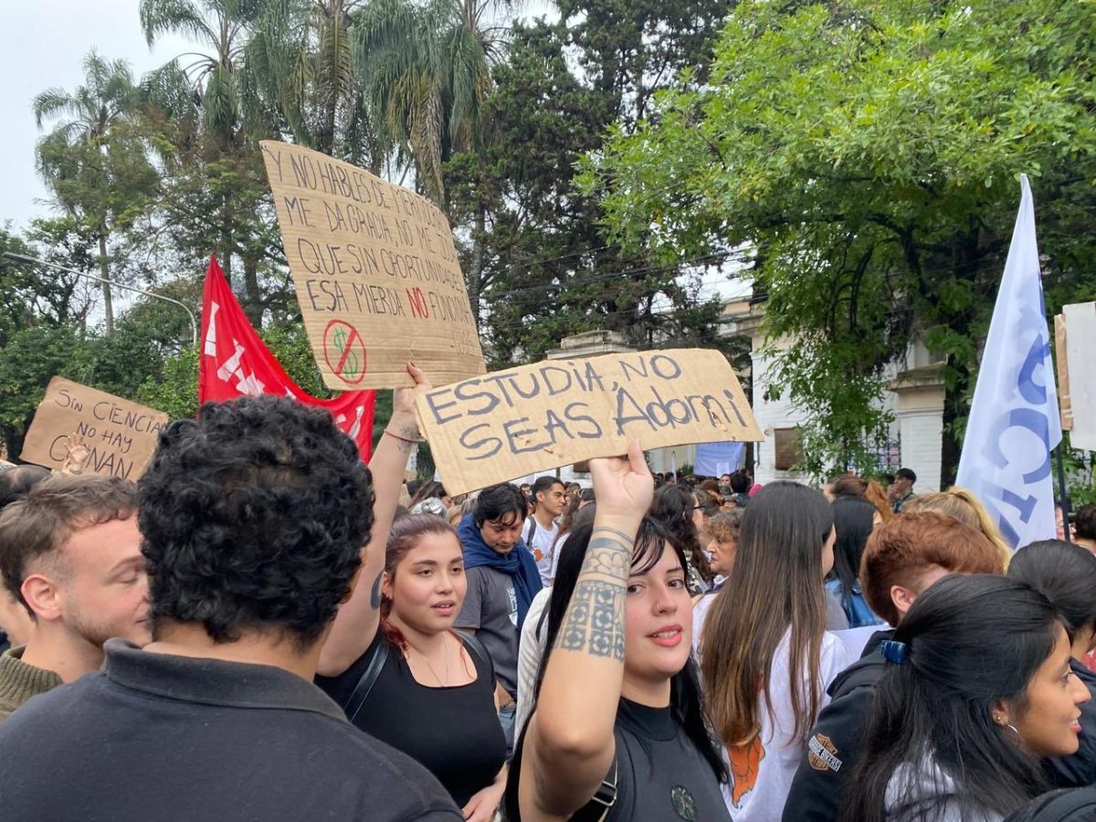 Los manifestantes llevan pancartas en rechazo del ajuste presupuestario que impacta directamente en el sistema de educación superior -a pesar del incremento de fondos del 140% anunciado por el Gobierno como un acuerdo, que el Consejo Interuniversitario desconoce-.