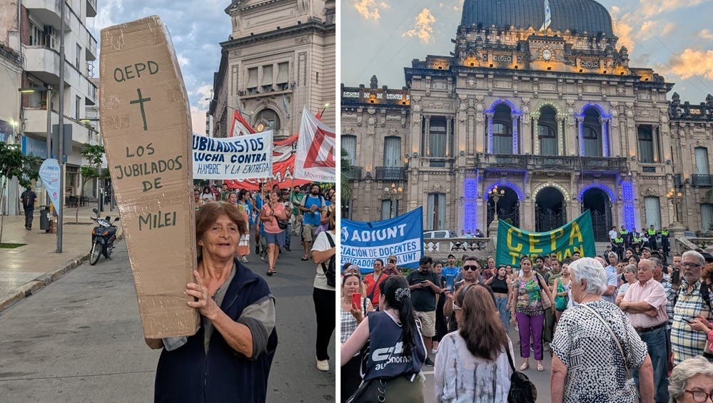 Jubilados autoconvocados, sindicatos, agrupaciones sociales y estudiantes universitarios marcharon este jueves en Plaza Independencia, en Tucumán, para manifestarse contra las políticas de ajuste del Gobierno Nacional. La protesta comenzó a las 10 de la mañana y continuó con una segunda convocatoria a las 18:30 frente a la Casa de Gobierno. Los participantes expresaron su preocupación por la situación económica y el impacto de los recortes en los jubilados.