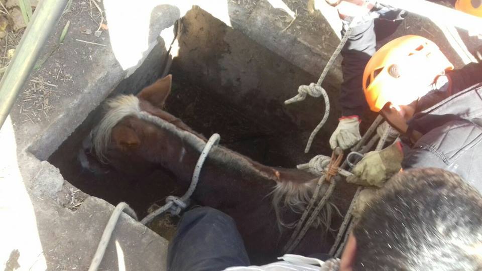 En equipo, lograron rescatar a un caballo que cayó a un pozo de agua