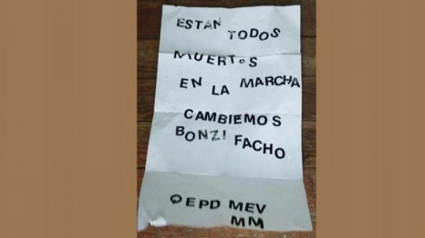 “Están todos muertos. En la marcha Cambiemos Bonzi facho. QEPAD MEV MM”, era el texto completo en letras recortadas en cinta aisladora dentro de un sobre negro.