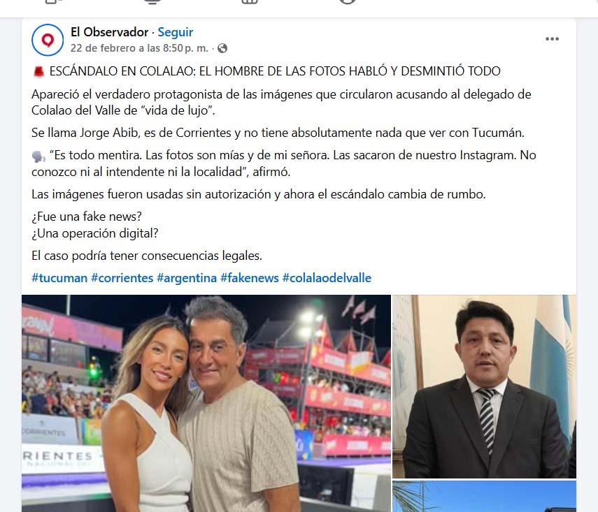 Un hombre de la provincia de Corrientes denunció que utilizaron fotos suyas y de su pareja para intentar perjudicar al delegado comunal de Colalao del Valle, en una publicación que lo acusaba de llevar una vida de lujo con fondos públicos. Jorge Abib afirmó que las imágenes viralizadas en redes sociales le pertenecen y que no tiene ninguna relación con el funcionario señalado ni con la política tucumana.