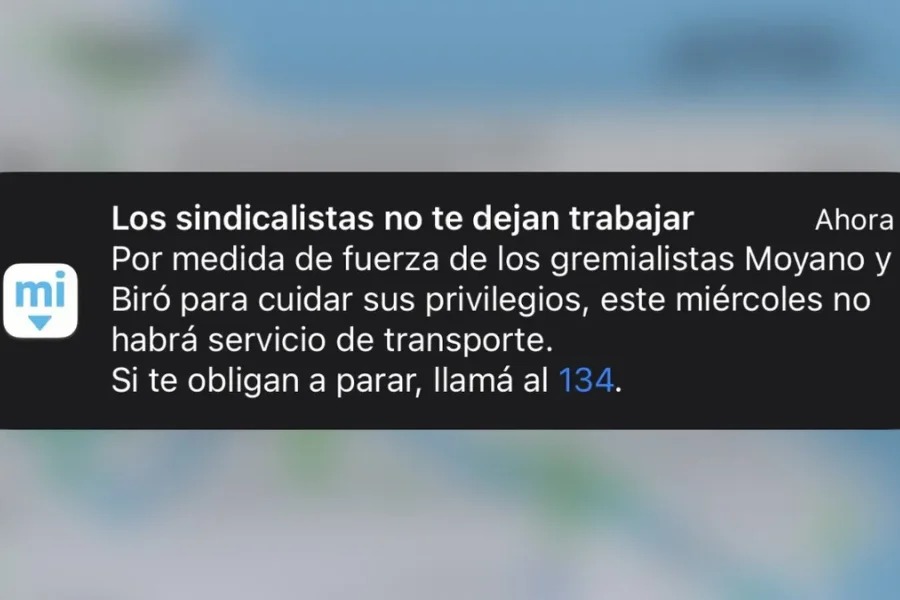 El Gobierno desató polémica este miércoles al utilizar la app Mi Argentina para enviar un mensaje en contra del paro nacional de transporte convocado por la Confederación Argentina de Trabajadores del Transporte (CATT). En la notificación, que excluyó a la Unión Tranviarios Automotor (UTA), el mensaje decía: “Los sindicalistas no te dejan trabajar”, en referencia a los gremios que anunciaron una huelga de 24 horas, afectando trenes, subtes, vuelos, camiones y transporte marítimo.