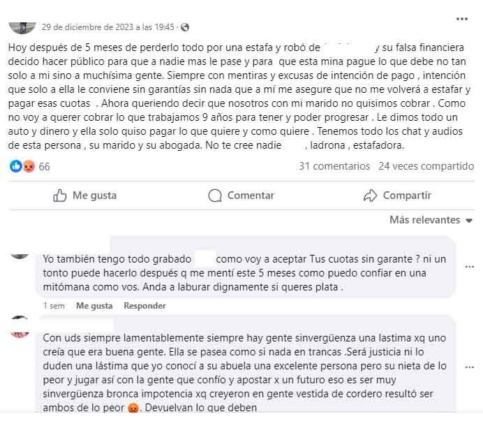 Una de las víctimas expresó su indignación públicamente en Facebook, compartiendo su experiencia y exigiendo que la presunta estafadora rinda cuentas. La publicación incluye acusaciones de engaño y robo, así como la descripción de pérdidas sustanciales.