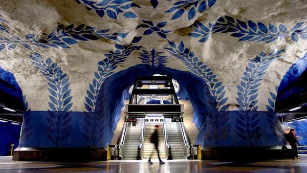 La red de Metro de Estocolmo comenzó a construirse en el año 1950, y actualmente cuenta con 110 estaciones que se distribuyen en tres líneas principales con cuatro ramales complementarios. La idea de decorar sus paredes con verdaderas obras de arte moderno no llegó hasta el año 1957, cuando se decidió convocar a un concurso para establecer las doce obras que hoy forman parte de esta verdadera obra de arte bajo tierra.