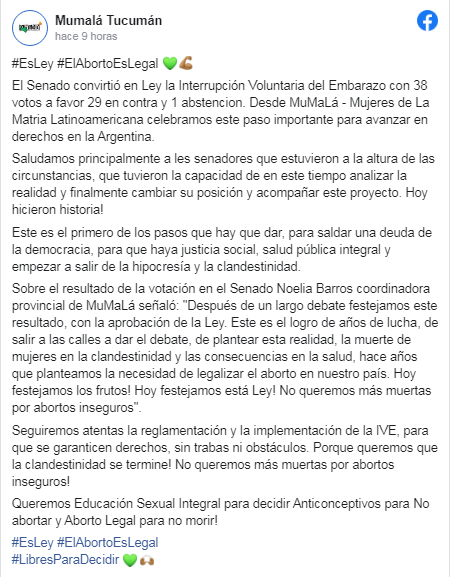 Como parte de la lucha que llevan a cabo, el movimiento Mujeres de la Matria Latinoamericana (Mumalá), emitió un comunicado a través de sus redes sociales, celebrando lo ocurrido en la madrugada del miércoles.
