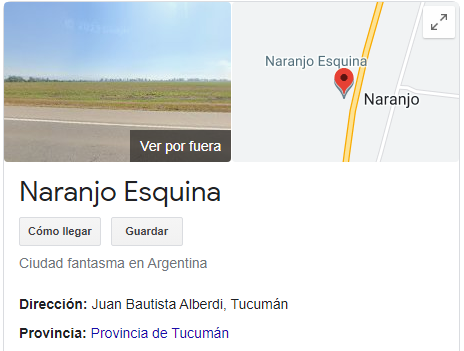 Si buscamos en Google ese mismo nombre, nos va a aparecer que Naranjo Esquina existe en la vida real y se encuentra a solo 4,9 kilómetros del centro de Juan B. Alberdi en el sur de Tucumán. Aunque el pueblo de la realidad es muy diferente al de la ficción. Uno está lleno de historias y personajes; el otro es una “ciudad fantasma”.