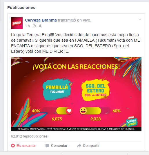 La votación comenzó a las 20 horas este miércoles y se extendió hasta las 21, en el transcurso los internautas debían dar click en la reacción “me encanta” de un video en vivo publicado en la fanpage de la marca de cerveza en facebook. Si bien en un principio Famaillá parecía liderar el porcentaje, cerca de la media hora el resultado se volcó a favor de los santiagueños, quienes ganaron por el 60% de los votos, contra el 40% que dejó a los tucumanos fuera de competencia.