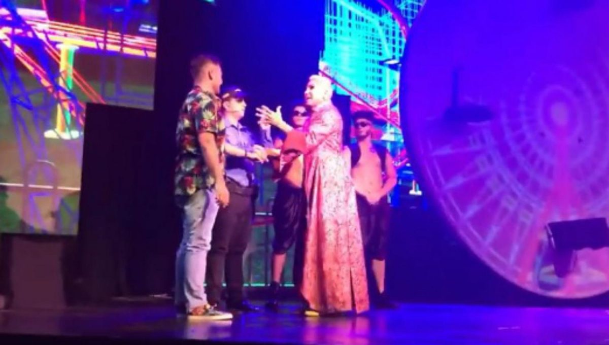 En plena función, durante la obra que realiza con Flavio Mendoza y teniendo como testigos a sus compañeros Cinthia Fernández y Fabián Mazzei, el Oficial Gordillo hizo algo que tiene precedentes: otra vez ayudó a un joven a pedir casamiento a su novia sobre el escenario.