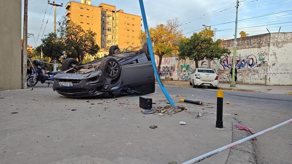 Un grave accidente de tránsito ocurrió este miércoles a las 6.40 de la mañana en la esquina de calles España y Rivadavia, donde dos autos chocaron y uno de ellos terminó volcado. Por motivos que aún se investigan, un Chevrolet Joy que circulaba por calle España colisionó con un Chevrolet Prisma que lo hacía por Rivadavia, lo que provocó que el primer vehículo se diera vuelta en plena vía pública.