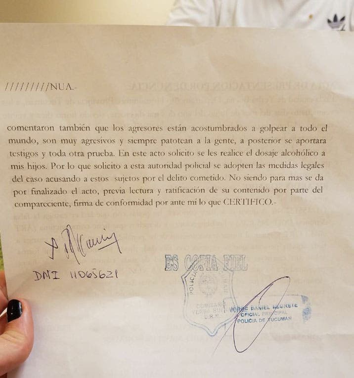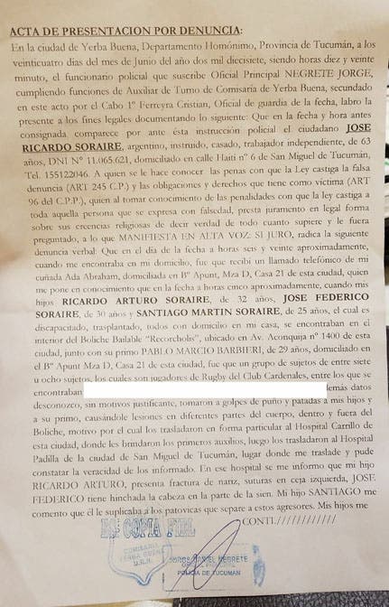 El padre de los heridos, de apellido Soraire, pidió en la denuncia “que se les practique el dosaje alcohólico a mis hijos”, al tiempo que manifestó que supuestamente los agresores serían jugadores de rugby del Club Cardenales.