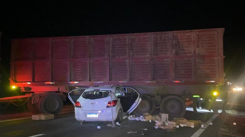 El auto, un Chevrolet Onix blanco, quedó incrustado en el lateral izquierdo del semi acoplado que era arrastrado por un camión marca Volvo, que terminó estacionado a un costado de la cinta asfáltica. Según el primer reporte policial, el conductor del camión habría intentado hacer un giro en “U” sobre la traza, lo que provocó el accidente.