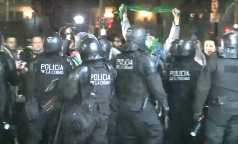 La represión no se hizo esperar y fue de la mano de la Policía Motorizada, que llegó hasta la esquina de Callao y Rivadavia para repartir palos, en sincro con los uniformados que estaban parapetados detrás de las vallas y desde allí dispararon balas de goma y gases lacrimògenos.